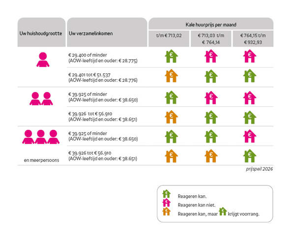 Verder wil de overheid dat u een woning huurt die bij uw inkomen past. Hier heeft zij regels voor opgesteld. Deze regels vertellen u en de verhuurders tot welke maximale huurprijs u mag huren. Dit wordt bepaald aan de hand van uw inkomen en huishoudgrootte en heet ‘passend toewijzen’. Hoe werkt passend toewijzen in de praktijk? In het schema hieronder (prijspeil 2026) ziet u op welke woningen u kunt reageren. Dit is afhankelijk van uw inkomen en huishoudgrootte.