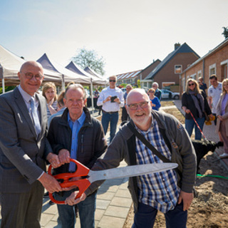 Op donderdag 28 april knipte Wethouder Bennie Wijnne van gemeente Barneveld, nieuwe bewoner de heer Van Rijssel en terugkerend (oud-)bewoner de heer Van de Pol het groene lint door tussen de nieuwe woningen aan de Paulus Potterstraat 6 en 8 in Voorth...