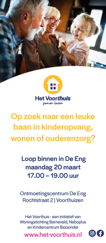 Op zoek naar een leuke baan in kinderopvang, ouderenzorg of wonen? Kom dan op maandag 20 maart naar De Eng tussen 17.00 en 19.00 uur voor meer informatie over onze vacatures!