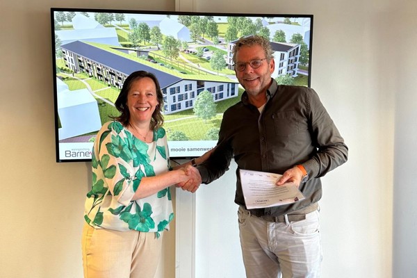 Foto ondertekening 51 appartementen: (links) Marieta Peek, directeur-bestuurder van Woningstichting Barneveld en Anno van der Werf, vestigingsdirecteur Van Wijnen Harderwijk schudden elkaar de hand na de ondertekening van de aanneemovereenkomst.
