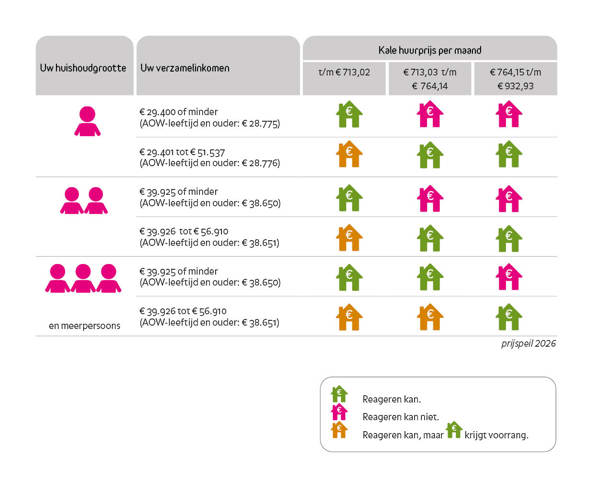 Verder wil de overheid dat u een woning huurt die bij uw inkomen past. Hier heeft zij regels voor opgesteld. Deze regels vertellen u en de verhuurders tot welke maximale huurprijs u mag huren. Dit wordt bepaald aan de hand van uw inkomen en huishoudgrootte en heet ‘passend toewijzen’. Hoe werkt passend toewijzen in de praktijk? In het schema hieronder (prijspeil 2026) ziet u op welke woningen u kunt reageren. Dit is afhankelijk van uw inkomen en huishoudgrootte.