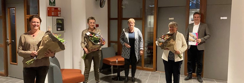 Fotobijschrift: v.l.n.r. Linda van Schoonhoven (secretaris HvB), Gerdien van der Ent (manager Wonen WsB), Liesbeth van Beek (interim-bestuurder WsB), Corrie Burink (penningmeester HvB) en Ronald Camstra (directeur-bestuurder WsB).