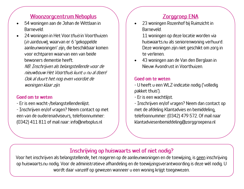 Heeft u of uw partner een zorgvraag en wilt u in aanmerking komen voor een aanleunwoning? Maak dan uw belangstelling kenbaar en schrijf u in bij (een van) de zorgorganisatie(s): woonzorgcentrum Neboplus of Zorggroep ENA. Voorheen wezen wij aanleunwoningen om en om toe aan een nieuwe huurder: de ene keer op voordracht van de zorgorganisatie en de andere keer door ons via huiswaarts.nu. Voortaan wijzen alleen de zorgorganisaties aanleunwoningen toe aan een nieuwe huurder. Op deze manier komen alle aanleunwoningen toe aan diegenen voor wie ze bedoeld zijn: mensen met een zorgvraag.