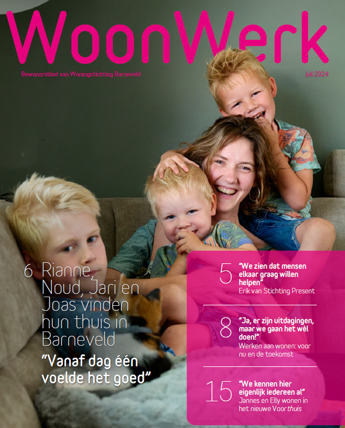 Omzien naar elkaar en verbinding wordt steeds belangrijker in onze samenleving. Veilig en prettig wonen en leven doe je niet alleen maar samen. In de nieuwe uitgave van ons bewonersblad WoonWerk lees je verschillende artikelen en verhalen hierover. Zo vertelt Erik van Stichting Present, hoe mensen elkaar helpen en vrijwilligers belangeloos de handen uit de mouwen steken. Jannes en Elly delen hun woonervaringen in het mooie nieuwe woonzorggebouw Het Voorthuis in Voorthuizen. Hier wonen en leven jong en oud, vitaal en kwetsbaar samen. Mét en zonder zorg. En Rianne, Noud, Jaro en Joas vinden hun thuis in Barneveld, nadat Rianne met urgentie de overstap maakte met haar drie jongens naar een fijne nieuwe woonplek. Daarnaast geven onze collega’s Mischa en Jolanda een beeld over de externe factoren die ons werk vertragen en hoe samenwerking dé sleutel is om verder te komen.