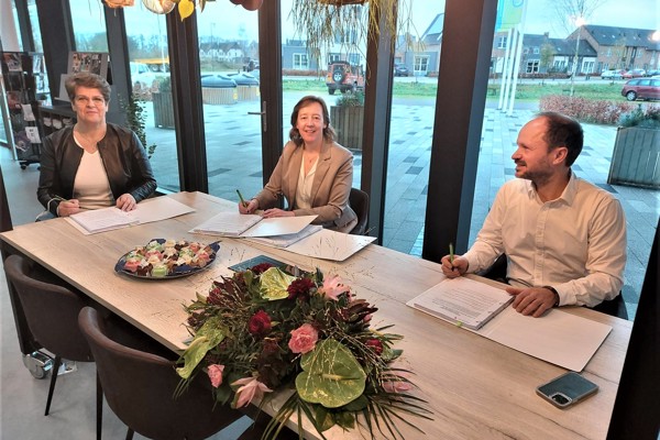 Vandaag, vrijdag 17 december, ondertekenden Eunice van Zomeren, voorzitter van de Raad van Bestuur van Neboplus, Michiel van Renes initiatiefnemer van Kindercentrum Bzzzonder en Marieta Peek-Marlet, directeur-bestuurder van Woningstichting Barneveld, de huurovereenkomst van Het Voorthuis in ontmoetingscentrum De Eng in Voorthuizen. De drie partijen bieden straks in woonzorgcomplex Het Voorthuis verschillende vormen van leven, wonen en zorg onder onder één dak.