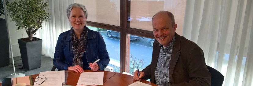 (Foto: Liesbeth Brouwer-de Jong, directeur-bestuurder Woningstichting Barneveld (links) en Richard Ariëns, projectleider Coen Hagedoorn Bouw)