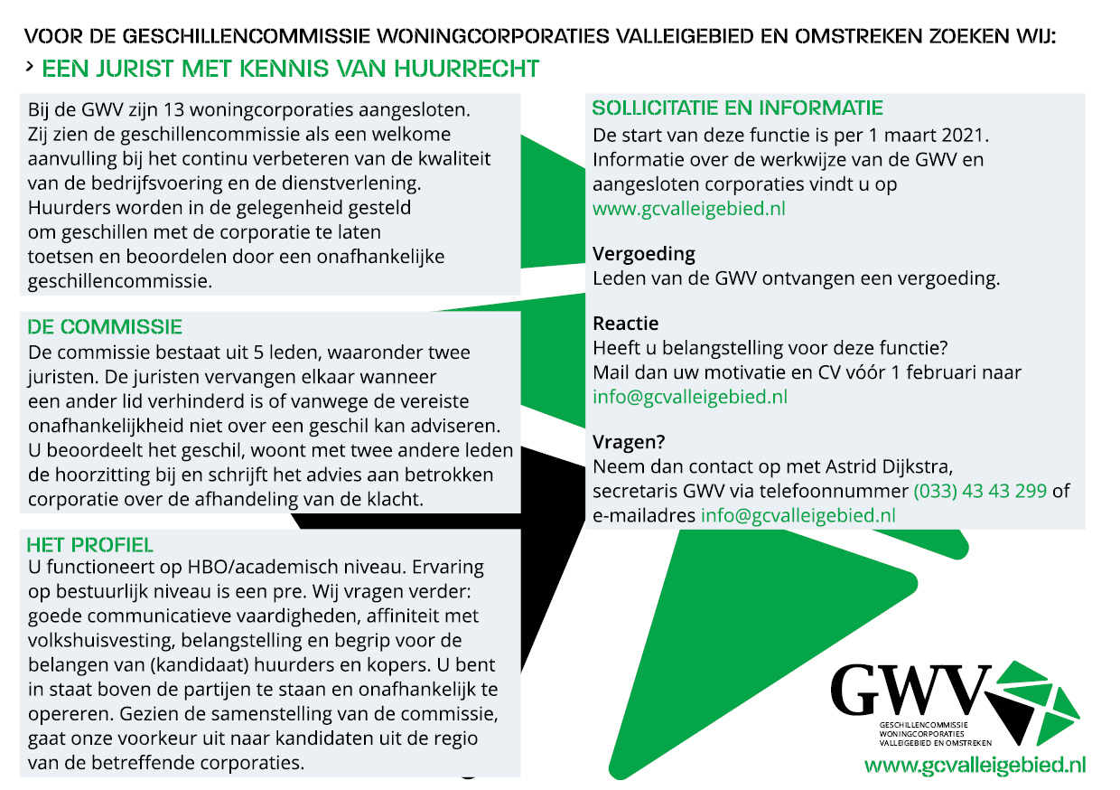 De Geschillencommissie Woningcorporaties Valleigebied zoekt een jurist met kennis van huurrecht.